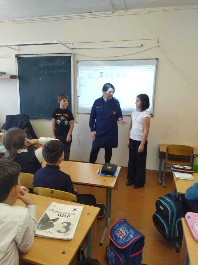 26.10. 2023 г. Инструктор по противопожарной профилактике Ломоносовского местного отделения ВДПО ЛО Ахмадуллина О.В. провела урок для 3 класса Русско-Высоцкой школы.