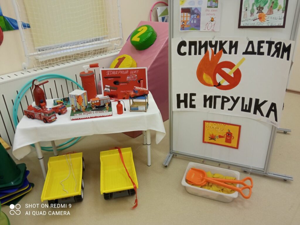 При подготовке к празднику детям было дано задание нарисовать рисунки на противопожарную тему и вместе с родителями сделать поделки. Лучшие работы были выставлены на всеобщее обозрение.