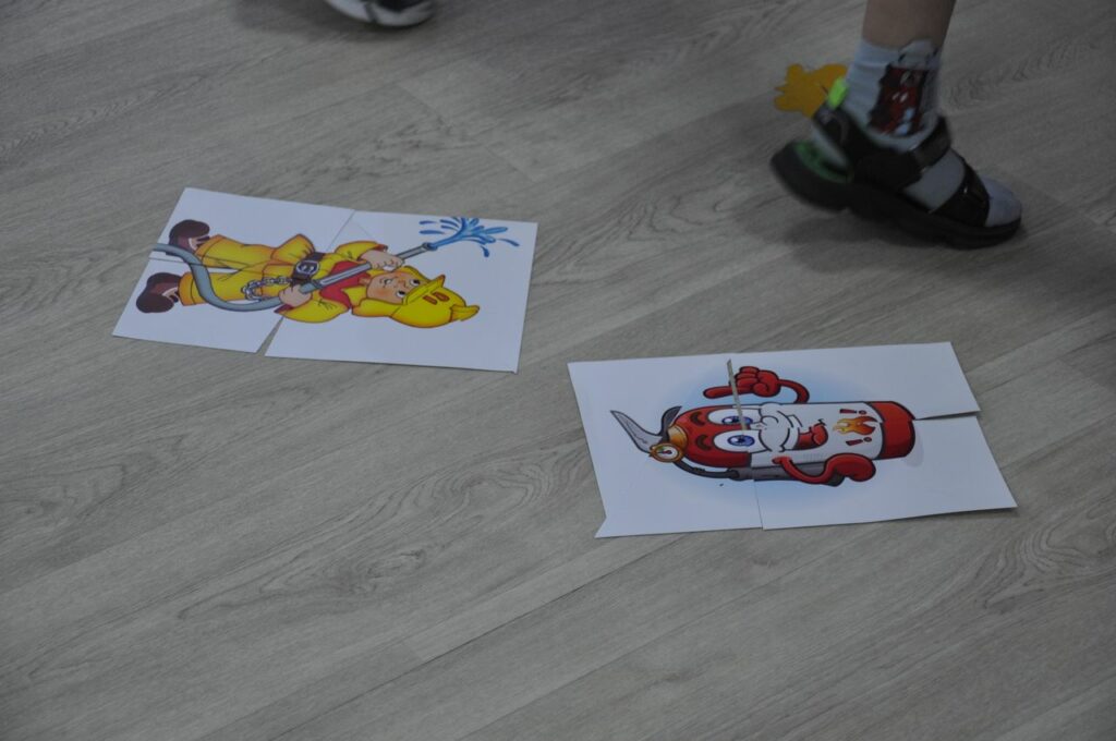 Беседа сопровождалась показом обучающего мультика. Дальше было самое интересное и удивительное: прошли «пожарные учения», во время которых каждый смог позвонить диспетчеру пожарной охраны, потушить условный пожар в доме и на время собрать мозаику с пожарной тематикой.