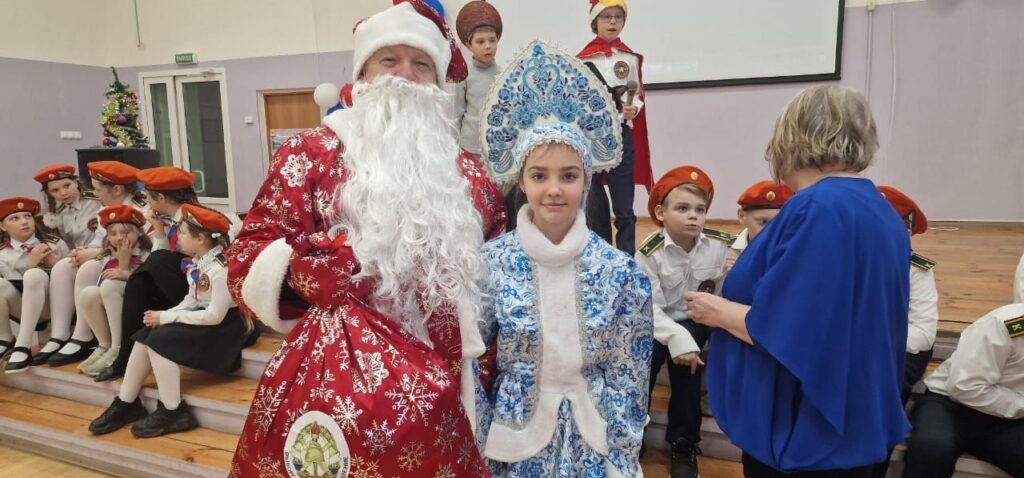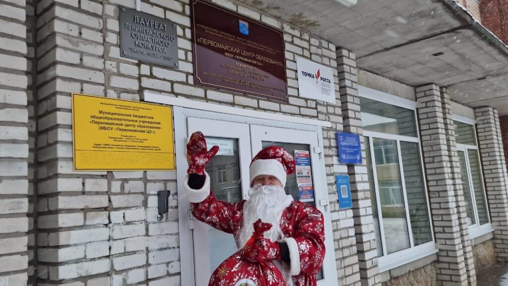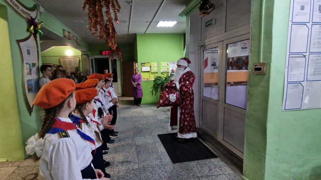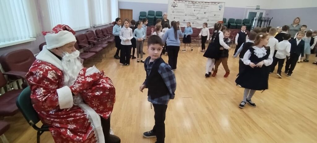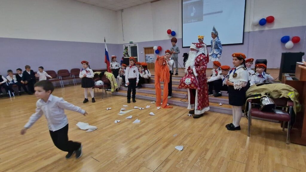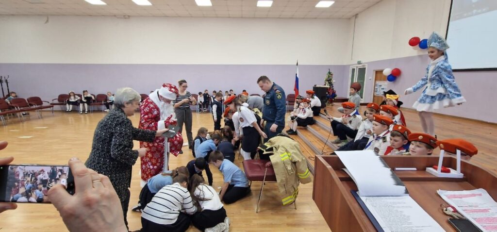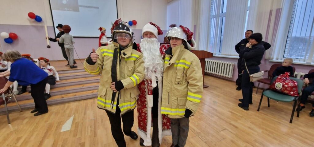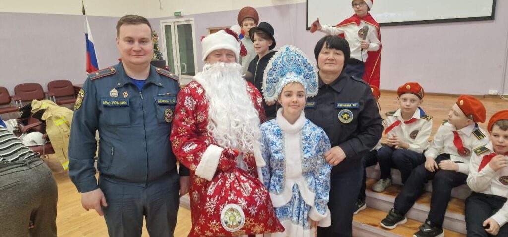 Поздравить праздниками ребят из дружины юных пожарных «Искрята» и детей начальных классов образовательной организации прибыл Дед Мороз с подарками от Выборгского МО ВДПО ЛО на пожарном автомобиле.