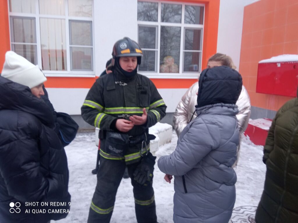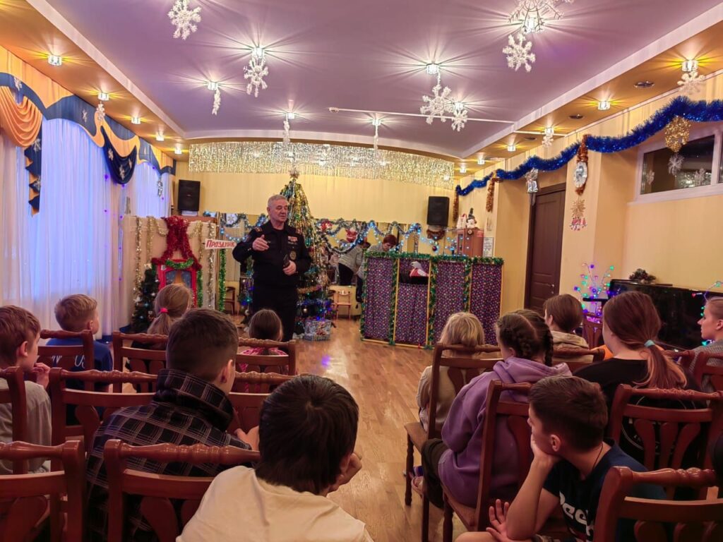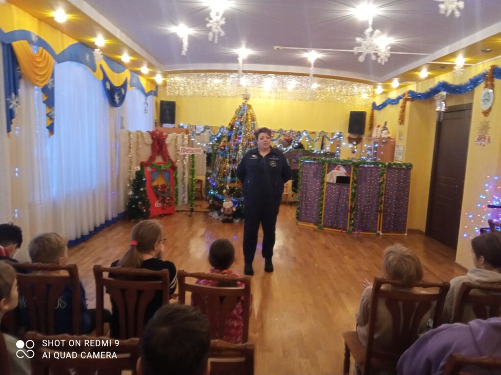 Заместитель Председателя совета местного отделения ВДПО ЛО Миклин В.Н. и инструктор противопожарной безопасности Асафоева Анастасия в музыкальном зале рассказали об истории пожарной охраны, основных требованиях правил пожарной безопасности при проведении новогодних праздников, украшении новогодних елок и действиях в случае возникновения пожара.