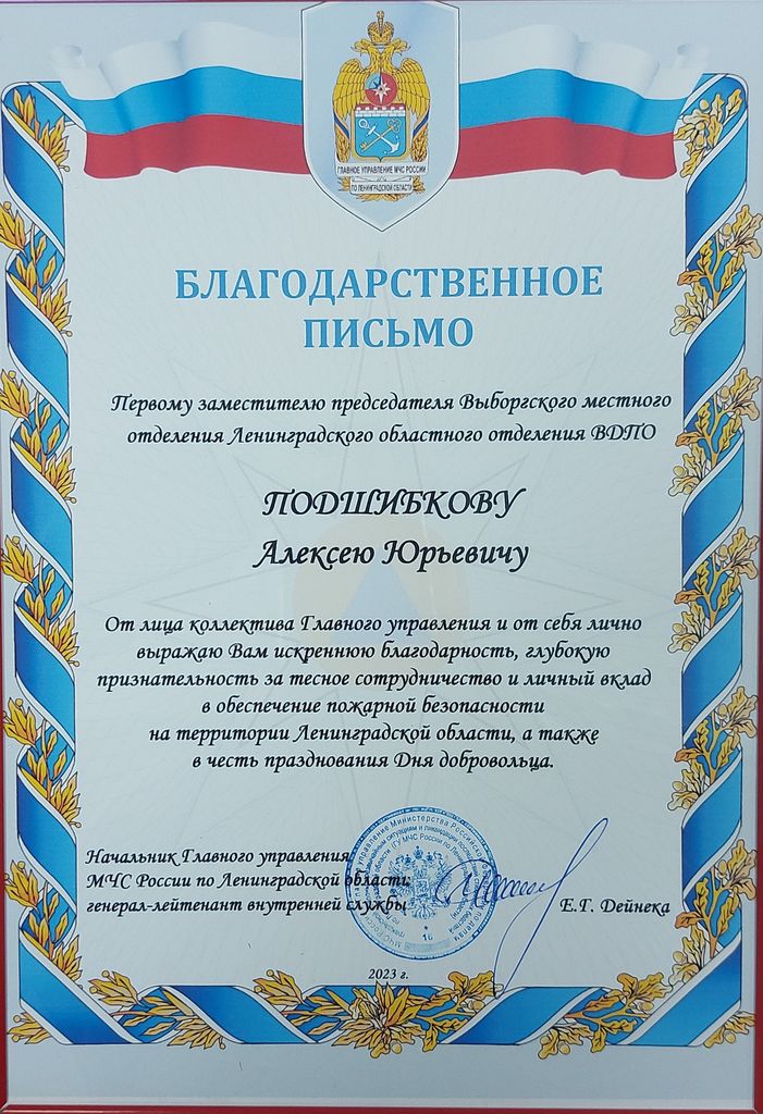 Благодарственным письмом начальника Главного управления МЧС России по Ленинградской области награжден 1-й заместитель Председателя совета Выборгского МО ВДПО ЛО Подшибков А.Ю.