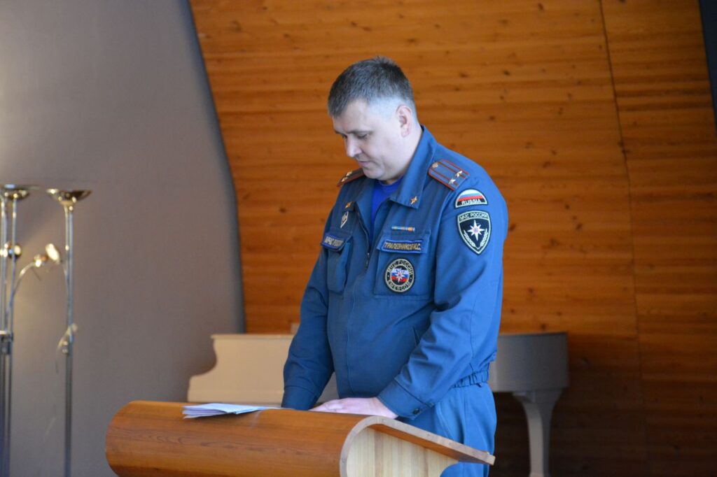 Со вступительным словом выступил заместитель начальника Главного управления МЧС России по Ленинградской области полковник внутренней службы Попугаев А.Ю.