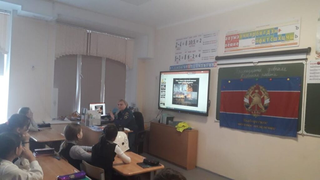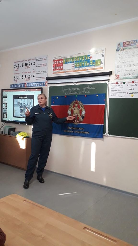 Сотрудники 26 пожарно-спасательного отряда Главного управления МЧС России по Ленинградской области, совместно с Выборгским местным отделением Всероссийского добровольного пожарного общества Ленинградской области пришли в 4 класс МБОУ «Средняя общеобразовательная школа № 6 города Выборга» для проведения урока по основам безопасности жизнедеятельности.