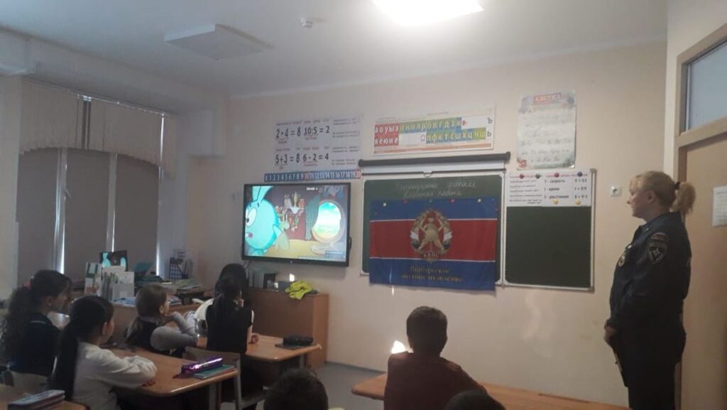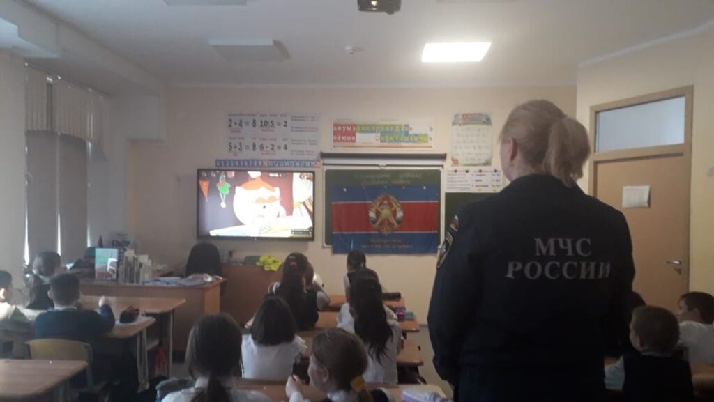 Сотрудники разыграли с детьми ситуацию, что делать, если ты дома один и начался пожар. А также как себя нужно вести в школе, если сработала пожарная сигнализация. Донося учащимся информацию через познавательные мульти, сотрудники тем самым закрепляют правила по пожарной безопасности.