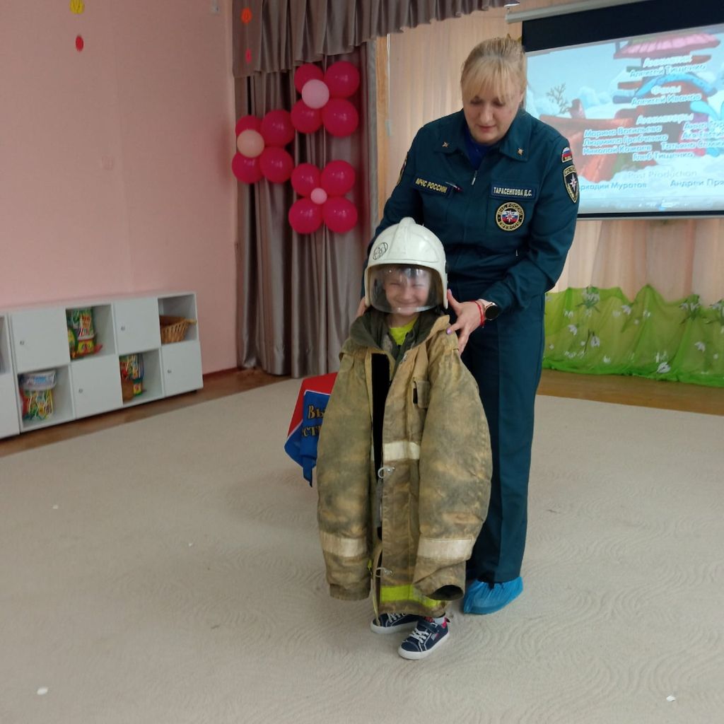 Деткам показали специальный мультик, пообщались на тему правил пожарной безопасности, проговорили алгоритм действий при пожаре. Особый восторг вызвала боевая одежда пожарного.