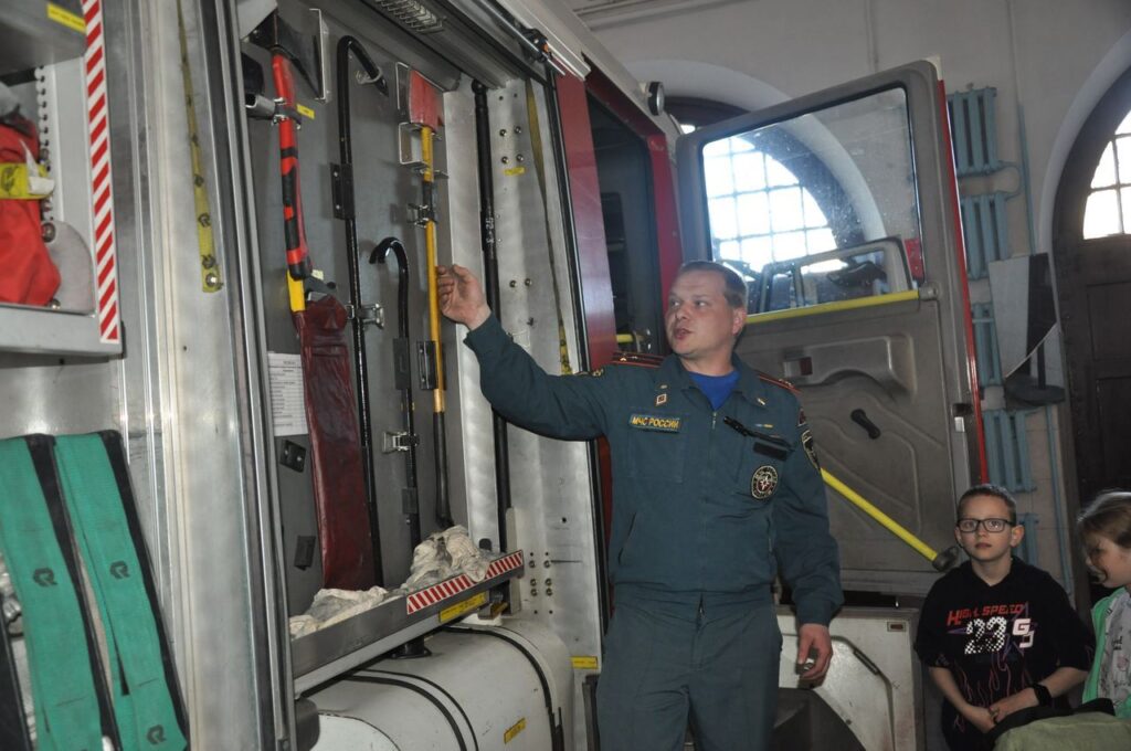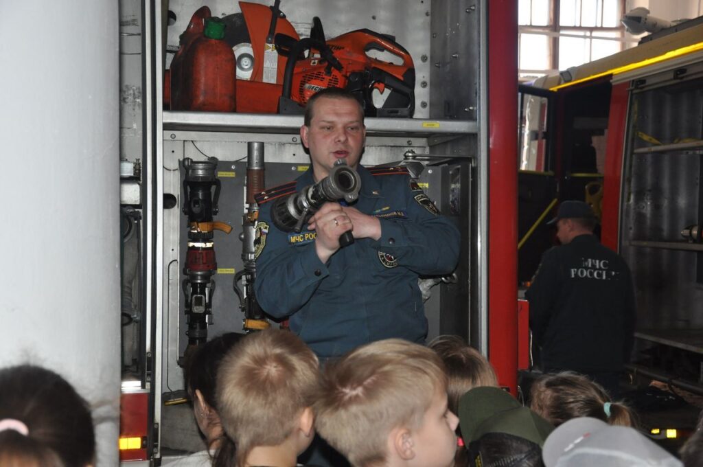 Учащихся знакомят не только с пожарно-техническим вооружением пожарной части, но и с боевой одеждой пожарного, техникой, с тем, как и чем оборудованы машины, для чего служит тот или иной предмет.