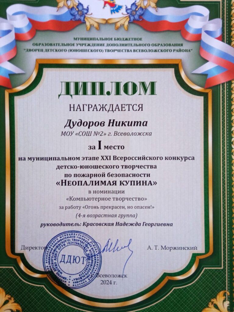 — Дудоров Никита за работу «Огонь прекрасен, но опасен» в номинации компьютерное творчество;