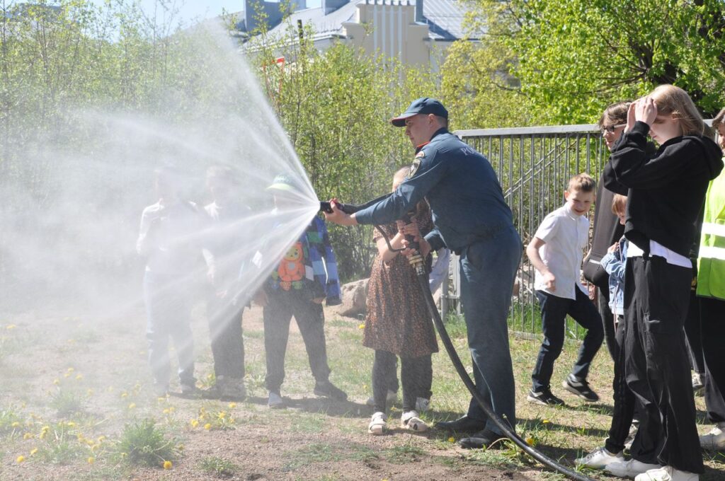 Ребята смогли посидеть в пожарной машине и примерить боевую амуницию. Большим счастьем оказалось для ребят поливать из пожарного рукава по условному возгоранию.