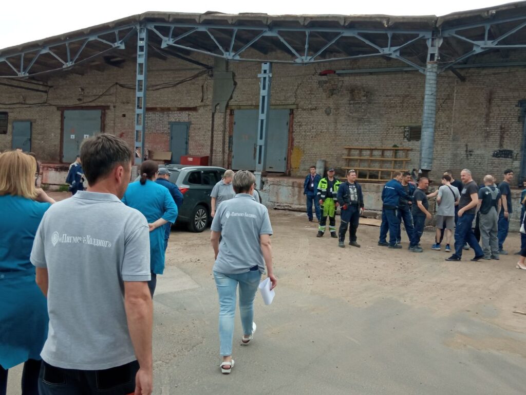 По замыслу проведения тактического учения произошел пожар в одном из помещений производственного здания. При срабатывании систем автоматической пожарной защиты включилось голосовое сообщении об эвакуации из здания. Сбор всего персонала осуществлялся на безопасном расстоянии от места пожара.