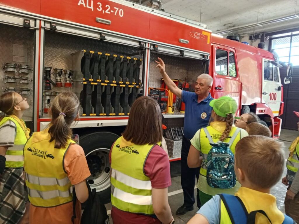 В связи с тем, что дежурный караул находился на выезде экскурсию по части, а также знакомство с тактико-техническими характеристиками пожарных автомобилей и их возможностями провели заместитель председателя совета местного отделения ВДПО ЛО Миклин В.Н. и инструктор по противопожарной профилактике Наталья Габрильянц.
