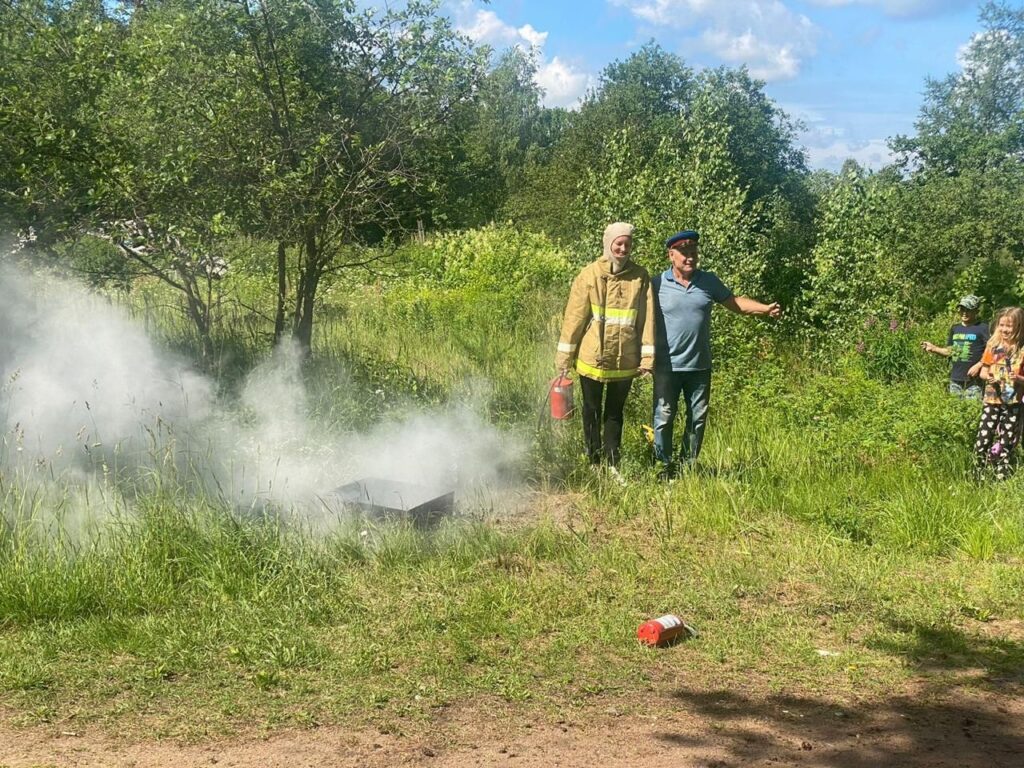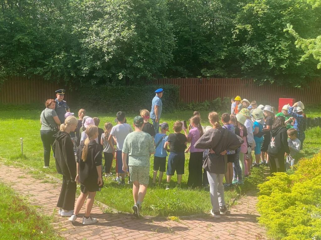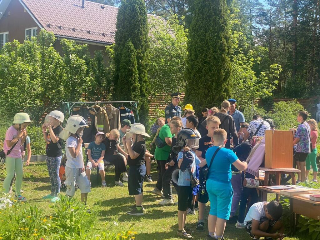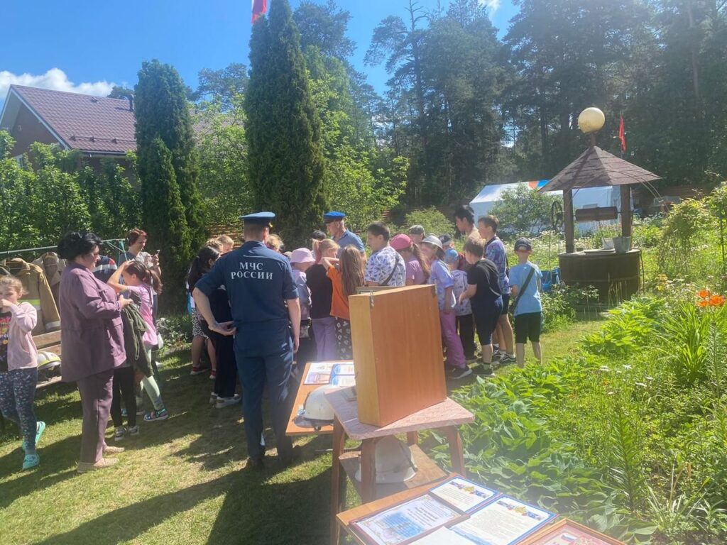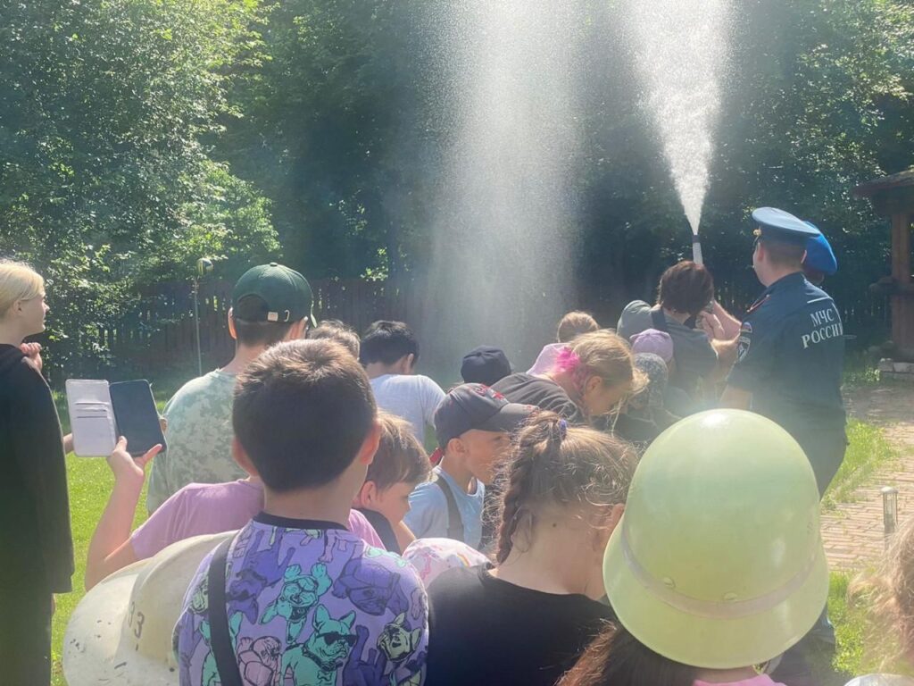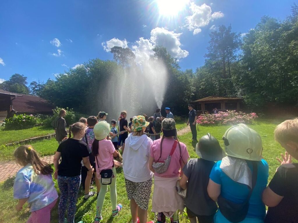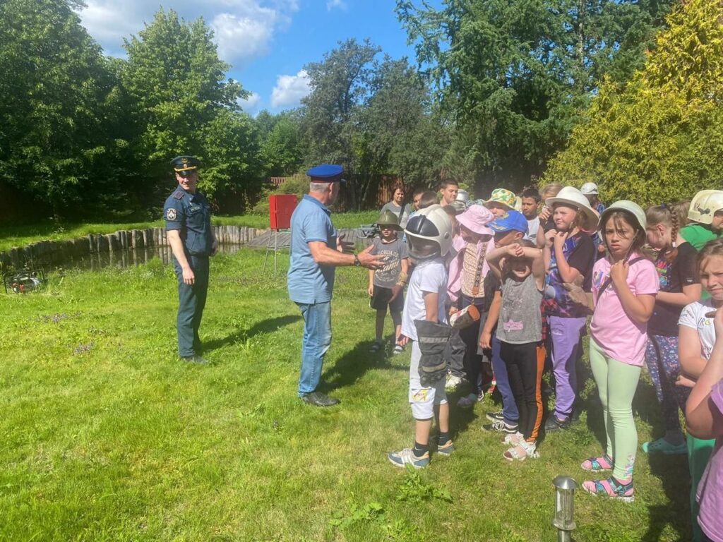 Виктор Васильевич организовал для детей занятие на открытом воздухе – ребята познакомились с профессией пожарного; примерили боевую одежду; узнали, как правильно звонить в пожарную службу и что нужно говорить в случае происшествия; узнали, что такое огнетушитель и как он устроен; вожатые потушили условный очаг пожара (горящий противень).