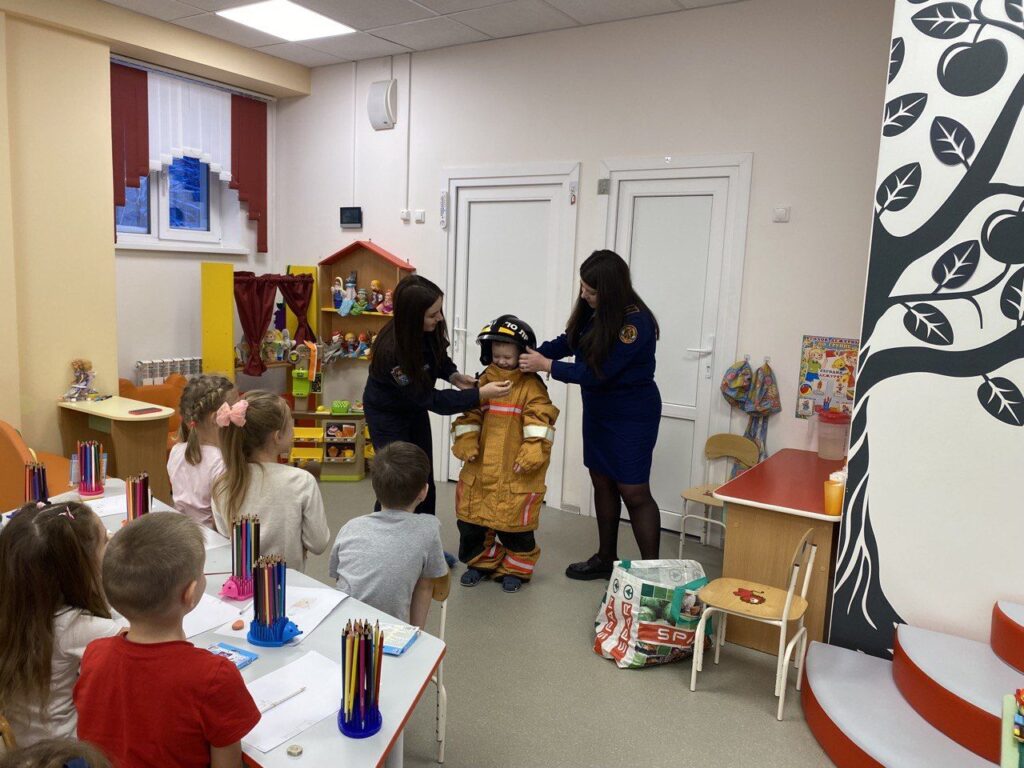 Далее ребята узнали о профессии пожарного, рассмотрели и примерили боевую одежду пожарного и подробно обсудили алгоритм действий в случае возникновения пожара.