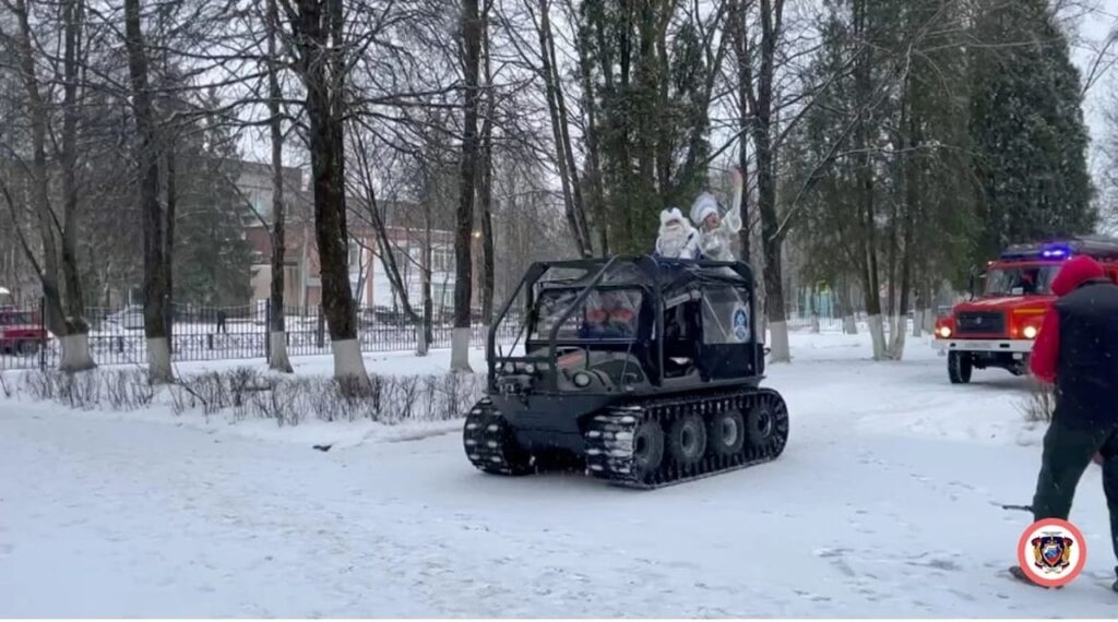 В г. Волхове в гости к ребятам на аварийно-спасательном снегоболотоходе прибыли Дед Мороз и Снегурочка вместе со спасателями аварийно-спасательной службы, пожарными ГКУ «Леноблпожспас» отряда Государственной противопожарной службы Волховского района и членами Волховского местного отделения ВДПО ЛО.