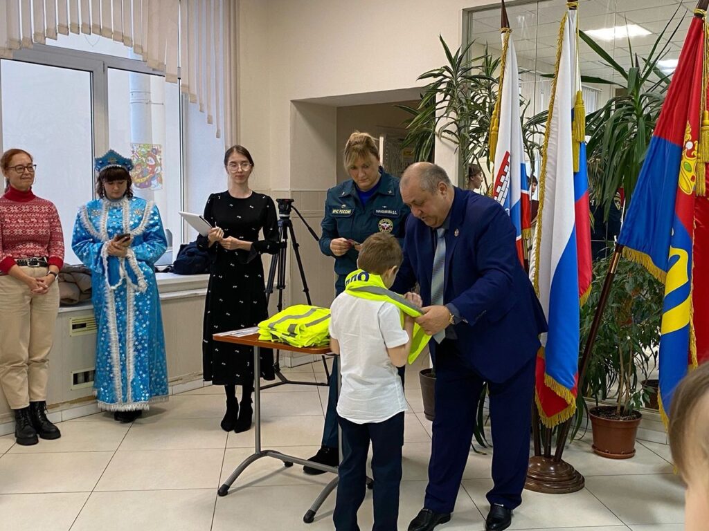 Юным пожарным вручили жилетку с логотипом ВДПО, значки и удостоверения. Ребята торжественно произнести клятву и получили именное знамя ДЮП «Пламя» – для многих ребят очень волнительно.
