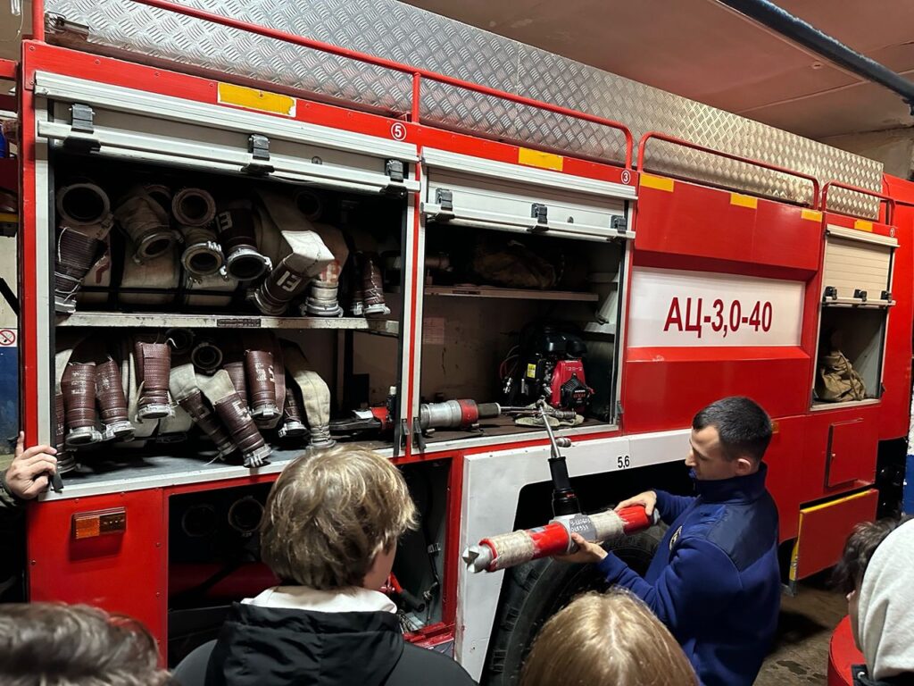 Экскурсию проводил начальник 4 караула Павлов Сергей Леонидович, он рассказал об имеющихся в распоряжении пожарной части пожарных машинах, что с ними связано, как они работают, чем оборудованы. Показал караульные помещения, гараж боевых машин, учебный класс, рассказал основные принципы пожарной безопасности.