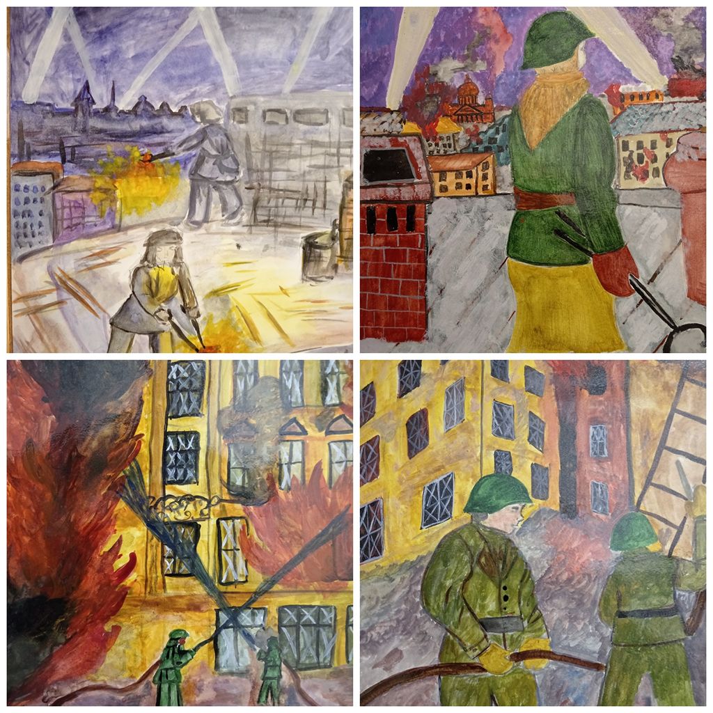 Каждый рисунок – это день, мгновение, миг блокады, глазами юных пожарных. Большинство из работ посвящено ленинградским пожарным…