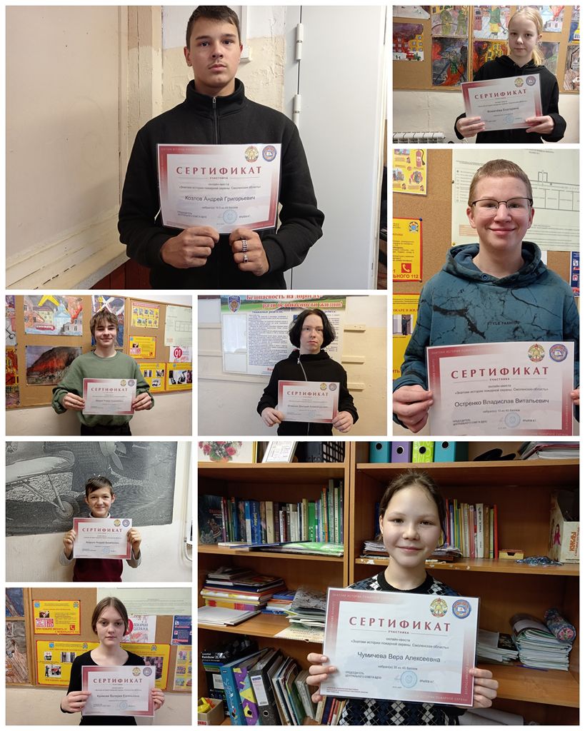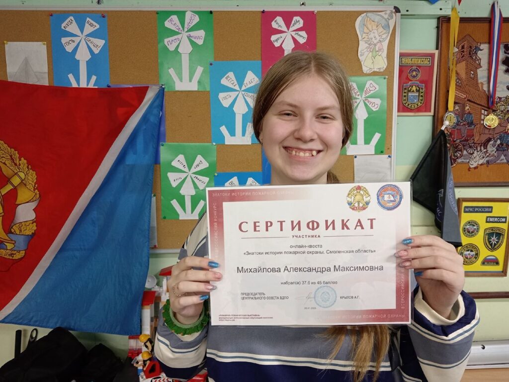 В дружине юных пожарных «Ладога» прошло вручение сертификатов участников и призёров Всероссийского онлайн-квеста «Знатоки истории пожарной охраны» (Смоленская область).