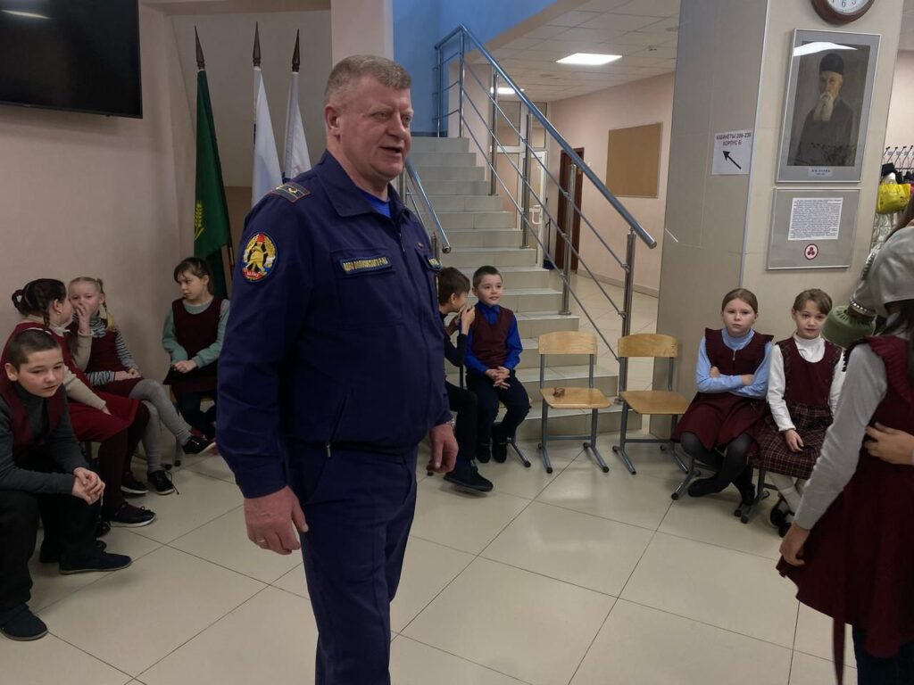 На уроке инспектор отдела надзорной деятельности и профилактической работы Волосовского района Стекольщикова Елена Валерьевна совместно с заместителем председателя совета Волосовского местного отделения ВДПО ЛО Янгиляевым Алексеем Махаремовичем, рассказали школьникам о гражданской обороне России.