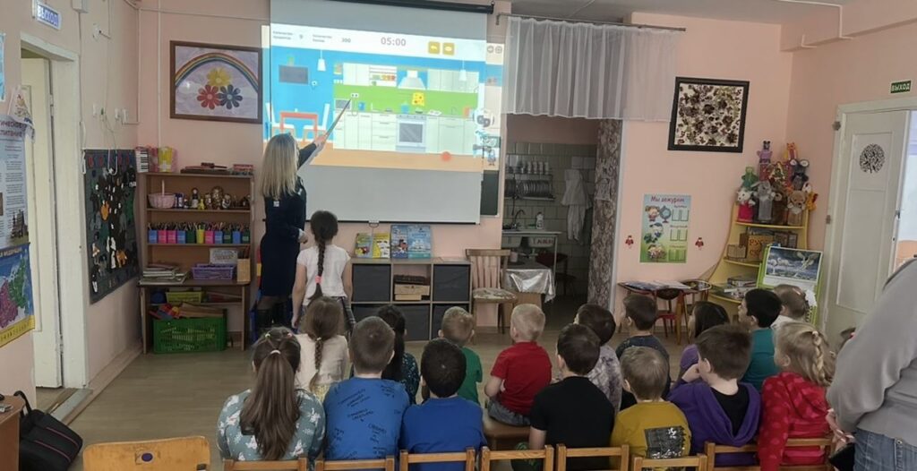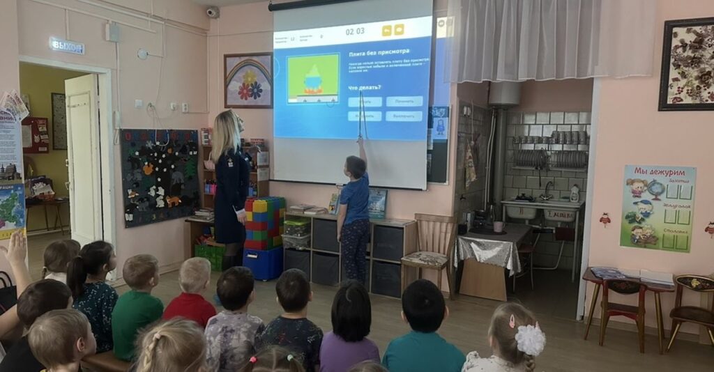После теоретической части перешли к интерактивным упражнениям, используя ресурс вдпо.рф. Дети выполняли роли настоящих пожарных инспекторов – их задачей было исследовать виртуальную квартиру и найти потенциальные источники возгорания. В ходе этого задания малыши научились определять опасные ситуации: оставленные без присмотра электроприборы, перегруженные розетки, не затушенные свечи, доступность спичек для детей.