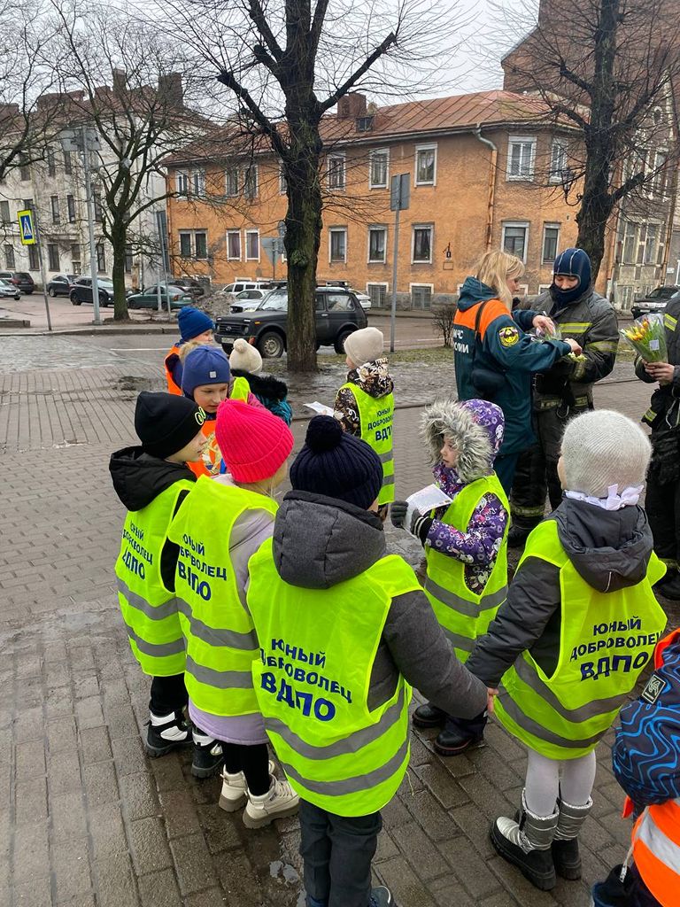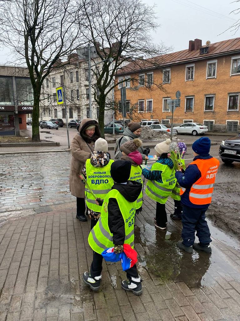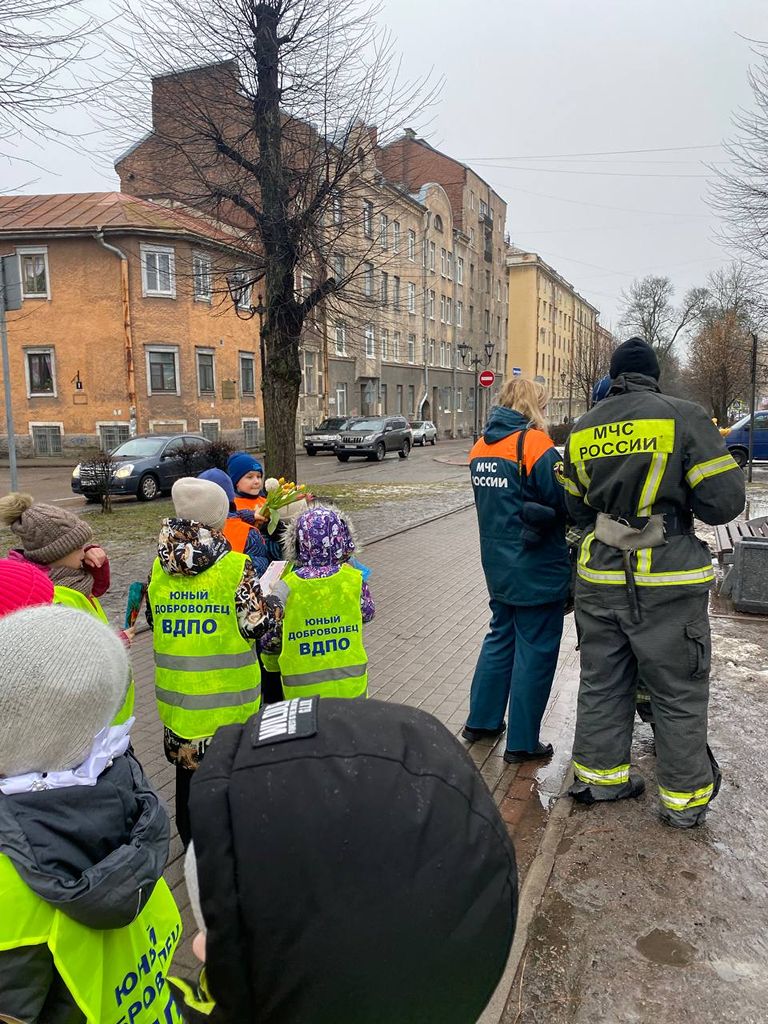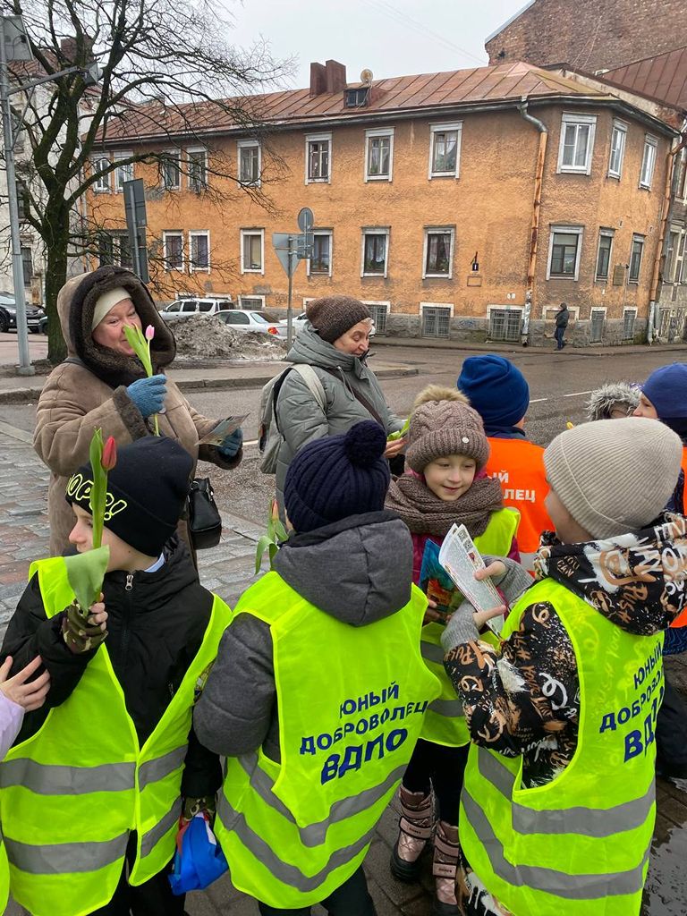 Юные добровольцы Выборгского местного отделения ВДПО ЛО 1 «А» класса МБОУ «Гимназии № 11 города Выборга» вышли на улицы города, для проведения профилактических бесед среди населения с раздачей памяток по пожарной безопасности и поздравлением женщин в преддверии наступающего праздника 8 марта. Маленькие джентльмены дарили встречающимся женщинам тюльпанчики.