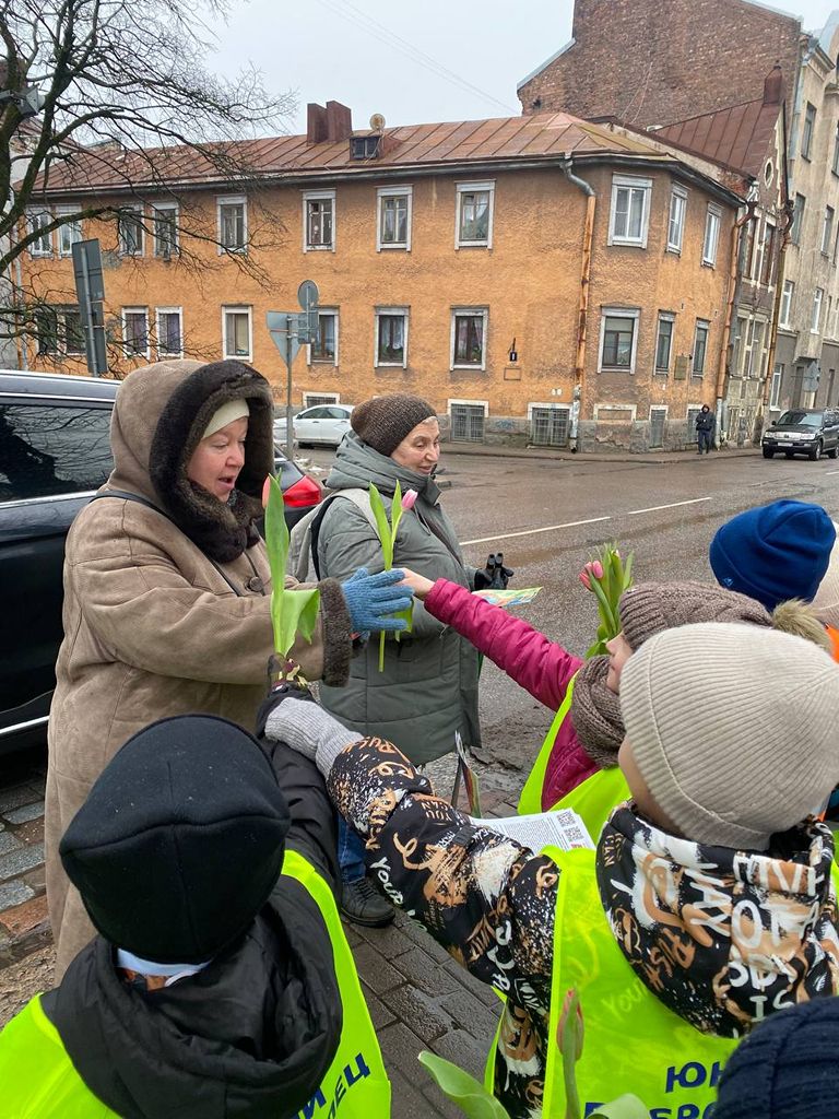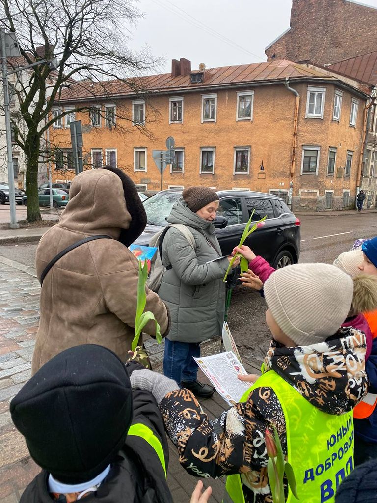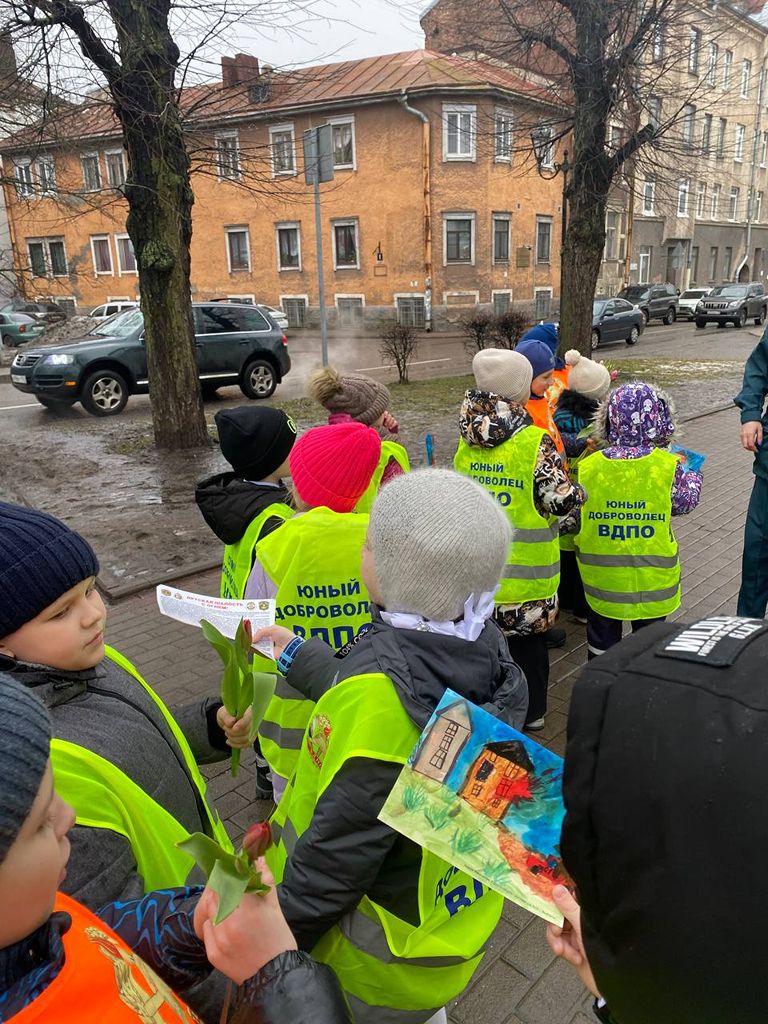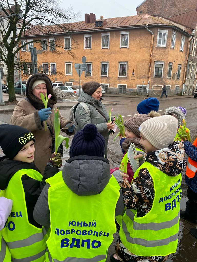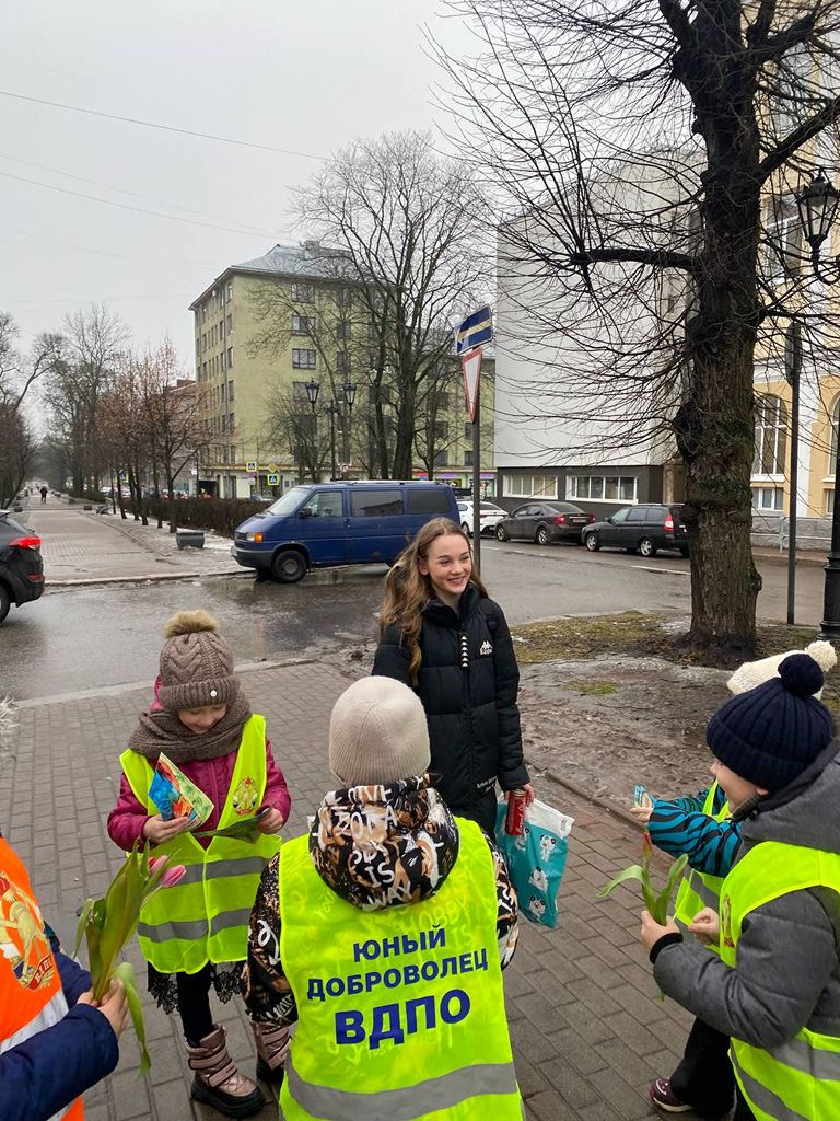 Юные добровольцы Выборгского местного отделения ВДПО ЛО 1 «А» класса МБОУ «Гимназии № 11 города Выборга» вышли на улицы города, для проведения профилактических бесед среди населения с раздачей памяток по пожарной безопасности и поздравлением женщин в преддверии наступающего праздника 8 марта. Маленькие джентльмены дарили встречающимся женщинам тюльпанчики.