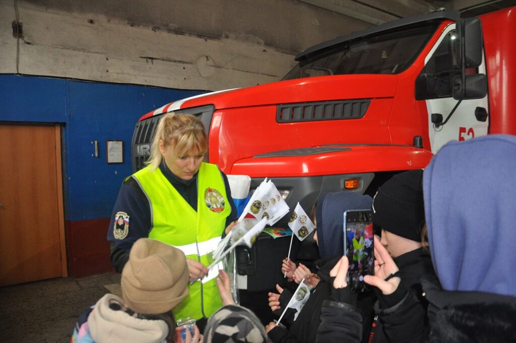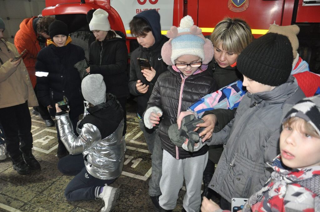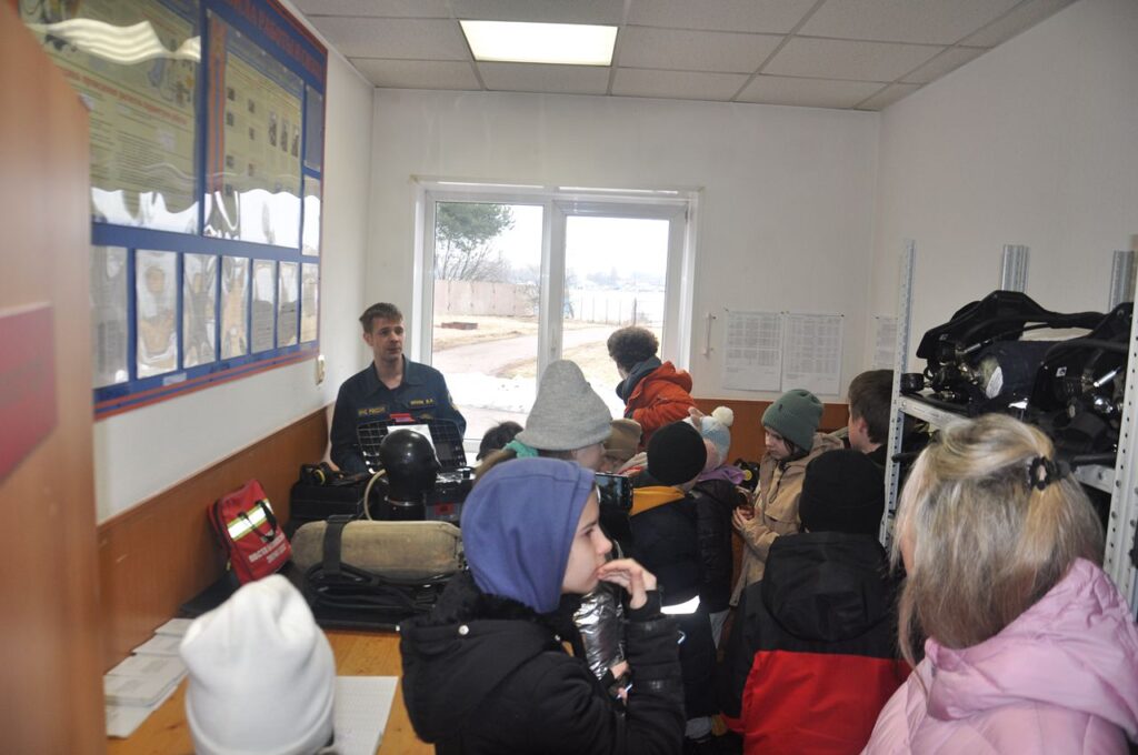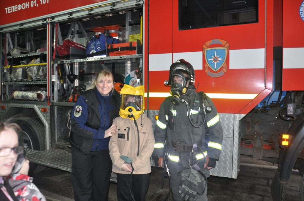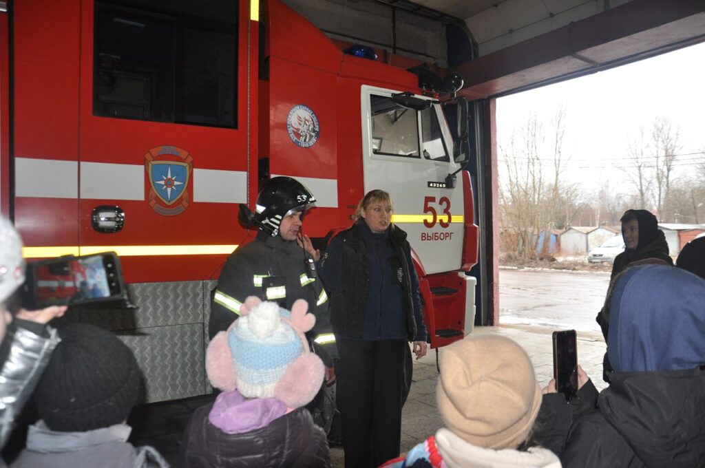 Инструктор социально-ориентированной деятельности Выборгского местного отделения Всероссийского добровольного пожарного общества Ленинградской области, провела по караульным помещениям пожарной части, показала учебный класс, кубки, которые ребятам завоевывают в соревнованиях, тренировочный полигон.
