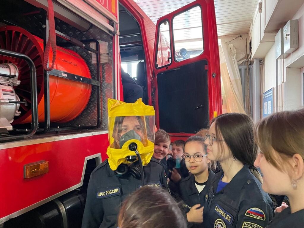 Ребята осмотрели помещения пожарной части, прошлись по рабочим зонам, включая гараж, где ребятам продемонстрировали пожарно-техническое оборудование. Все желающие могли посидеть в кабине и осмотреть крышу пожарной машины.
