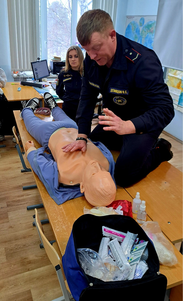 Потом ребята получили возможность потренироваться проведению сердечно-легочной реанимации на тренажёре для обучения оказанию первой помощи.