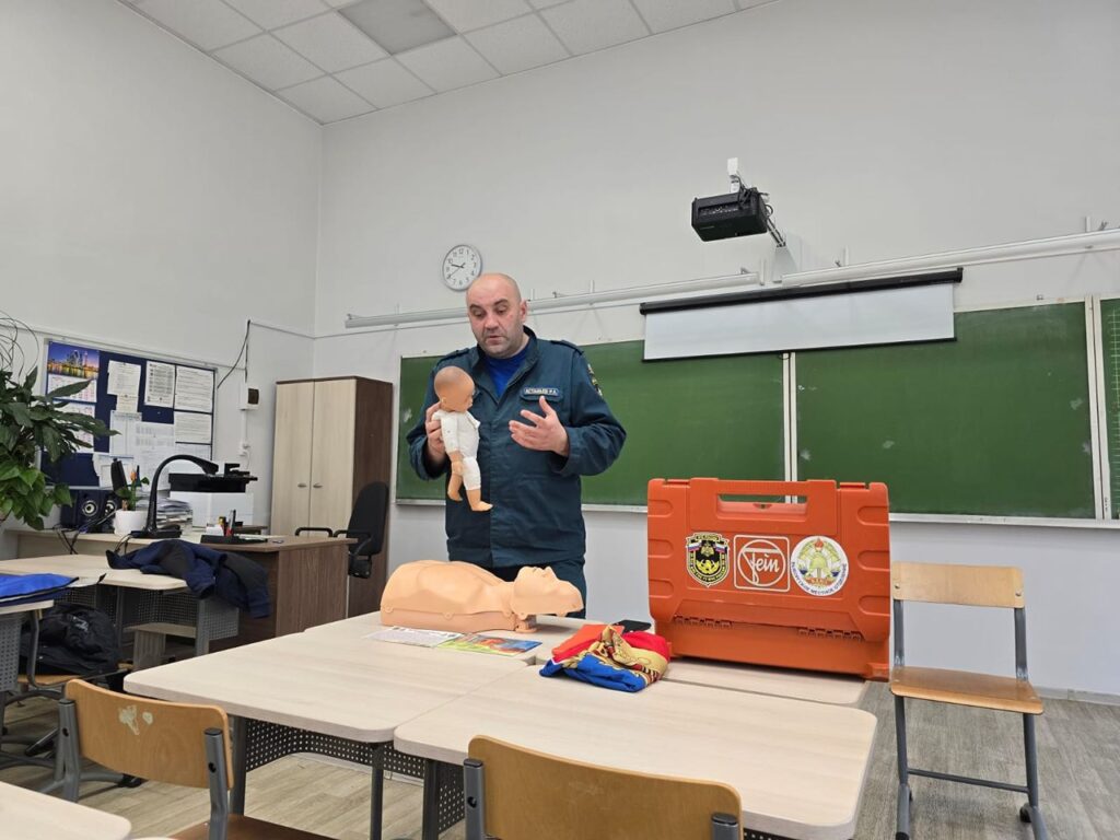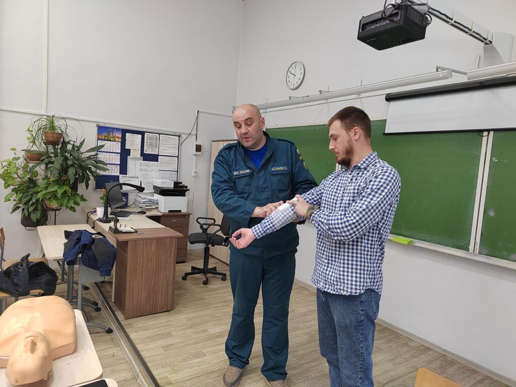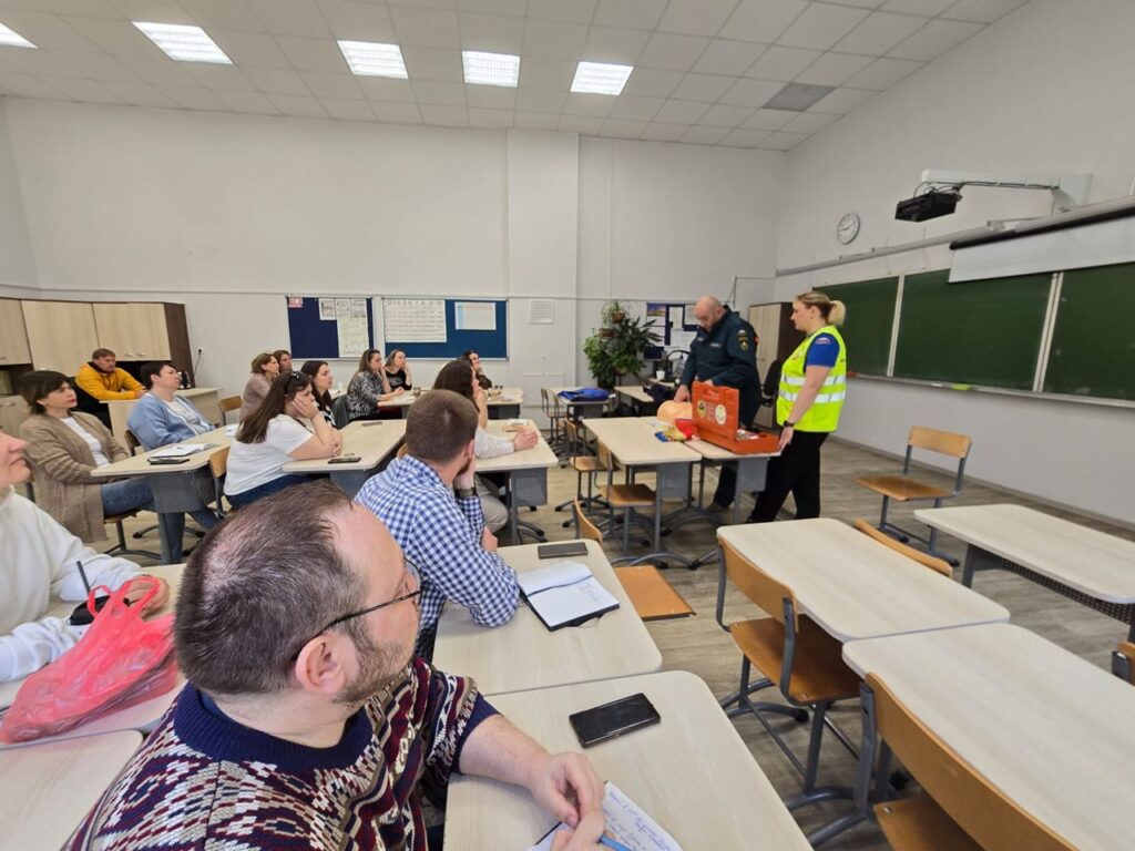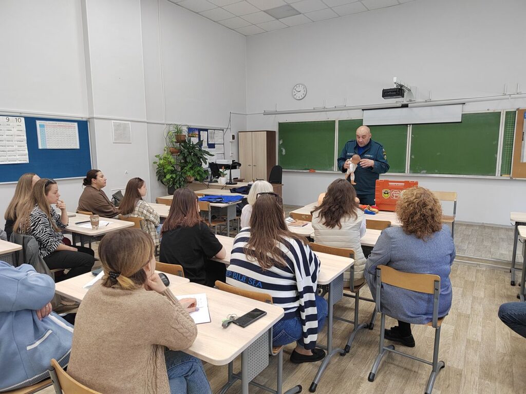 Учителям рассказали что делать если ребенок получил солнечный удар, пошла кровь из носа, если ребёнок сломал руку или подавился. Также рассказали о реанимационных действиях. О укусах клещей и змей.
