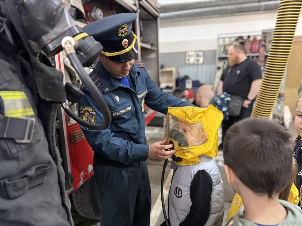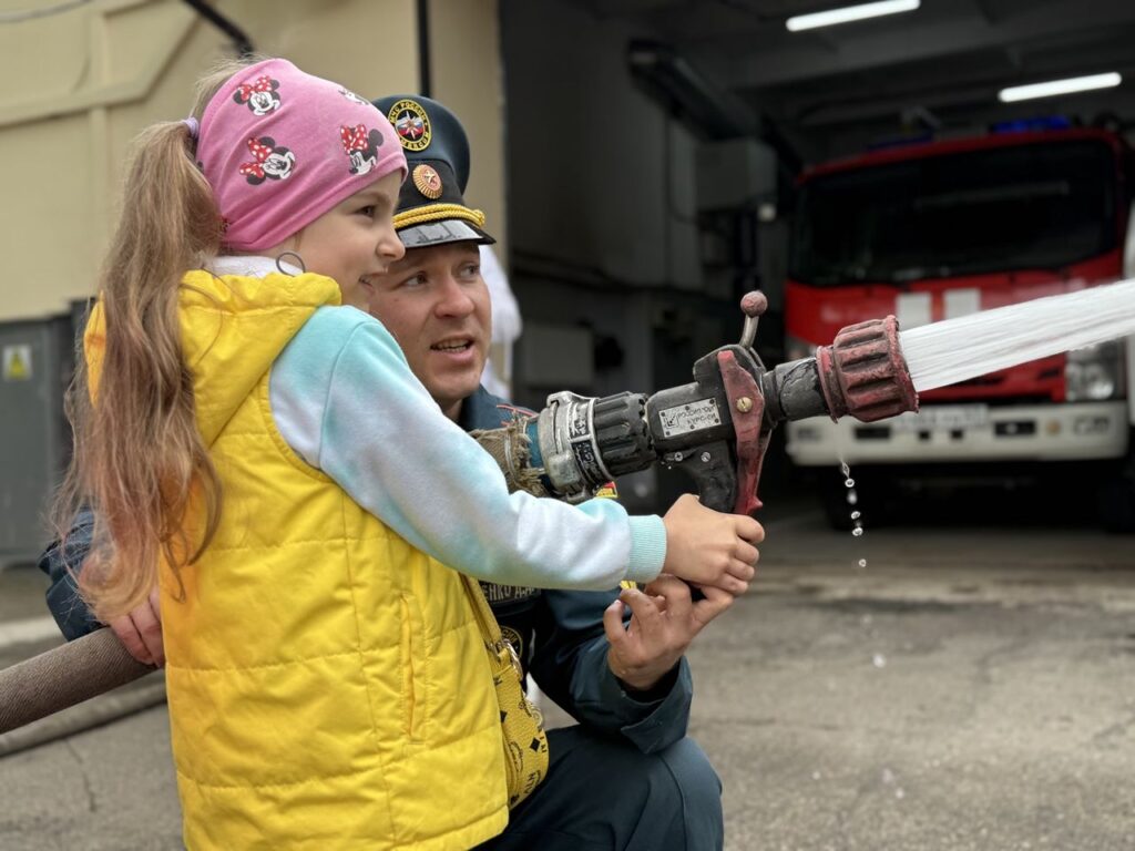 Бойцы дежурного караула во главе с начальником караула Дмитриевым Крамаренко познакомили детей с пожарным оборудованием, провели экскурсию по подразделению, вместе повторили номера экстренных служб и правила поведения на каникулах. Для малышей была также проведена интерактивная игра «сбей мяч», для имитации тушения условного пожара, которая принесла детским сердцам много радости.