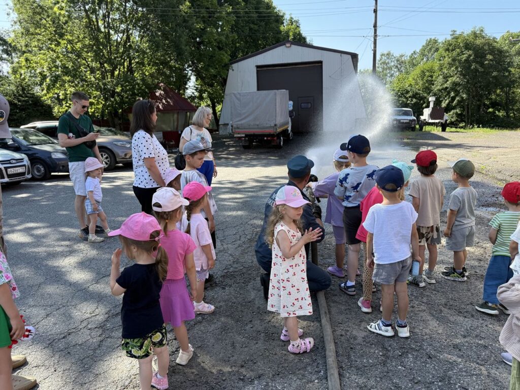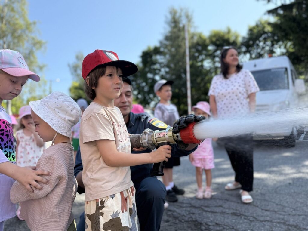 Боевое развертывание от пожарной автоцистерны, проведенное бойцами караула, впечатлило и детей, и взрослых. А подача воды по рукавной линии и из пожарного ствола стало спасением в жару, и очень порадовало детей.