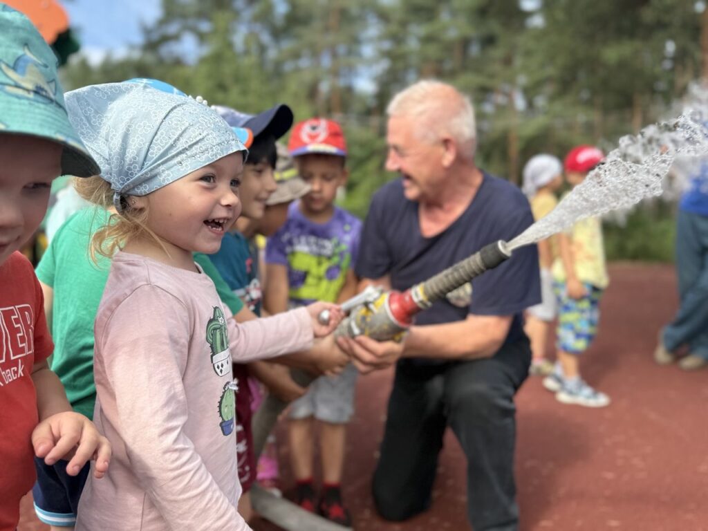 Самое интересное их ожидало в завершении встречи. Пожарные провели боевое развертывание и подали воду на тушение условного пожара. Под присмотром профессионалов дети попробовали подавать воду из настоящего пожарного ствола. Восторгу не было предела!