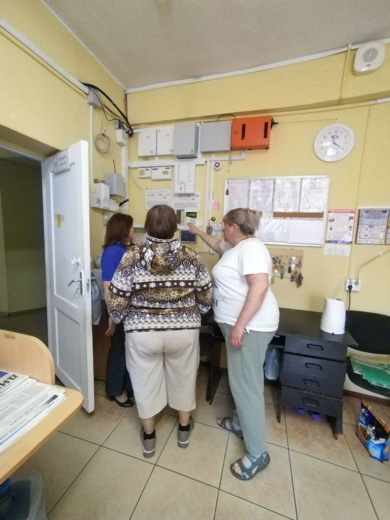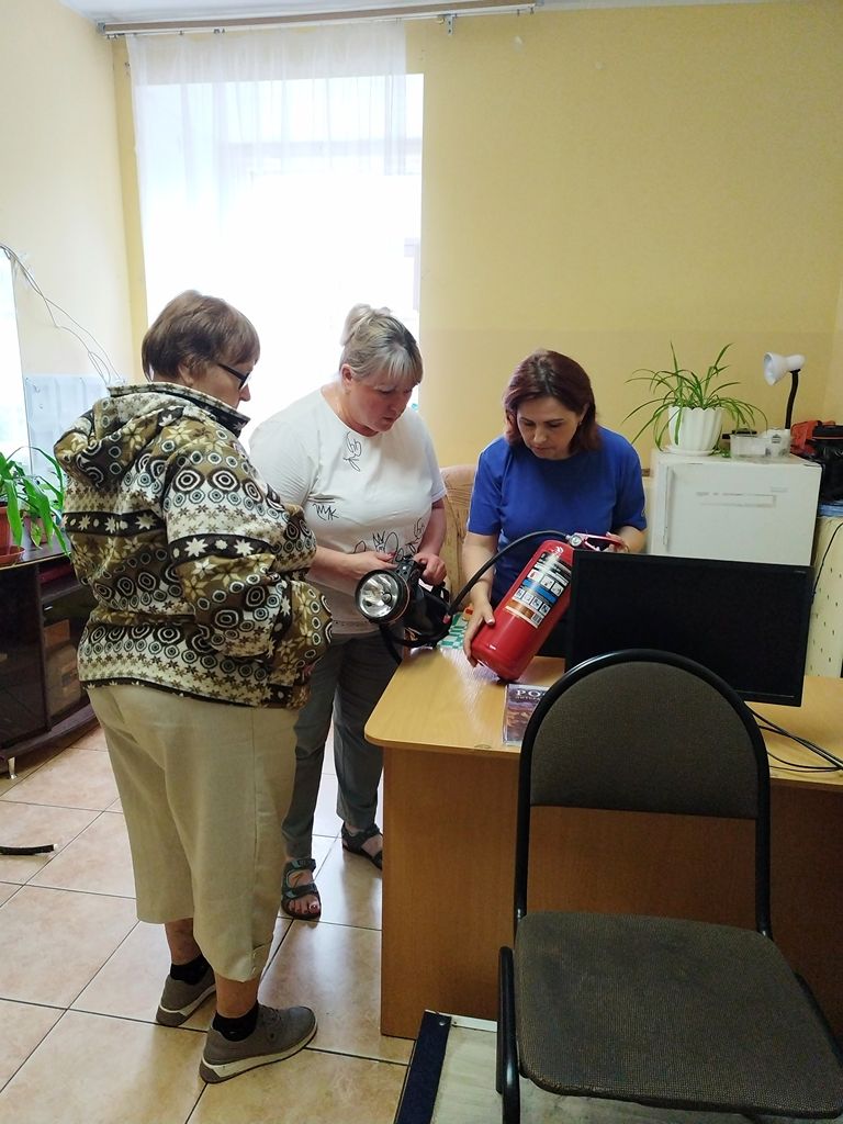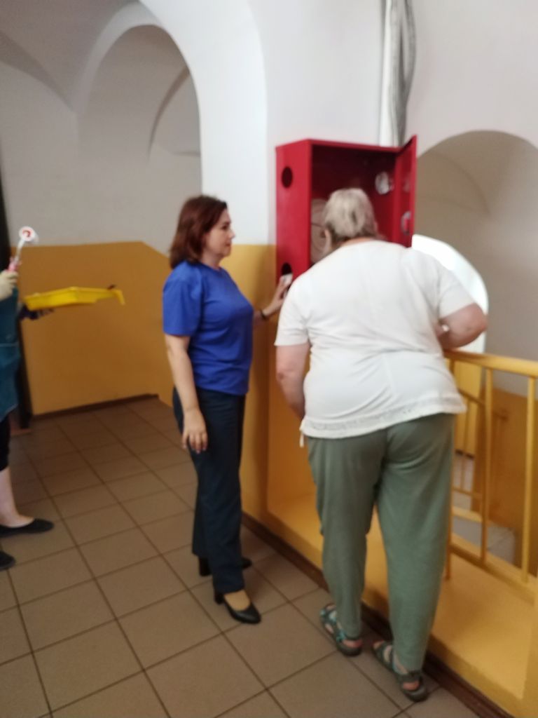 Мы прошли по коридорам, проговорили про необходимость проведения тренировочной эвакуации в начале сентября, про подготовку необходимой документации, проверили огнетушители, рассказали основные правила их эксплуатации.