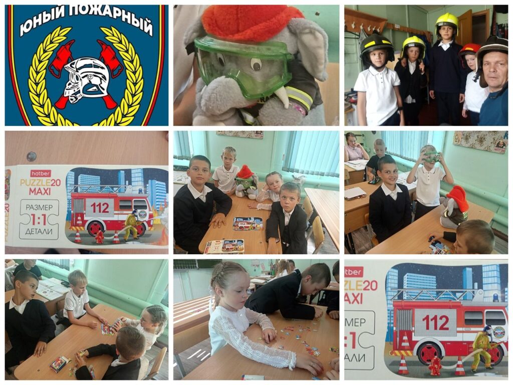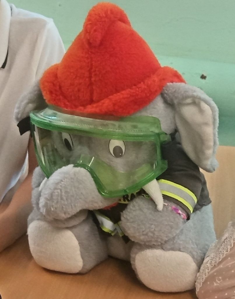 В ходе занятия дети изучили план работы на учебный год и познакомились с талисманом дружины слоном Парамоном. Вместе с ним они сложили несколько пазлов на пожарную тематику, а в завершении переменок наши малыши примерили настоящие пожарные каски.