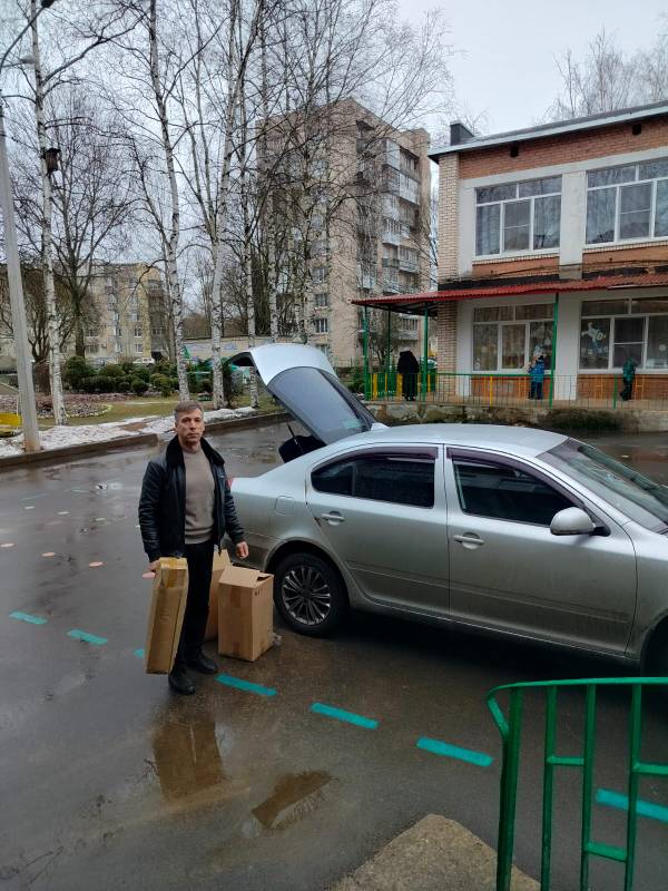 На фото сотрудник местного отделения ВДПО ЛО, который на безвозмездной основе, занимается доставкой огнетушителей в дошкольные учреждения города.