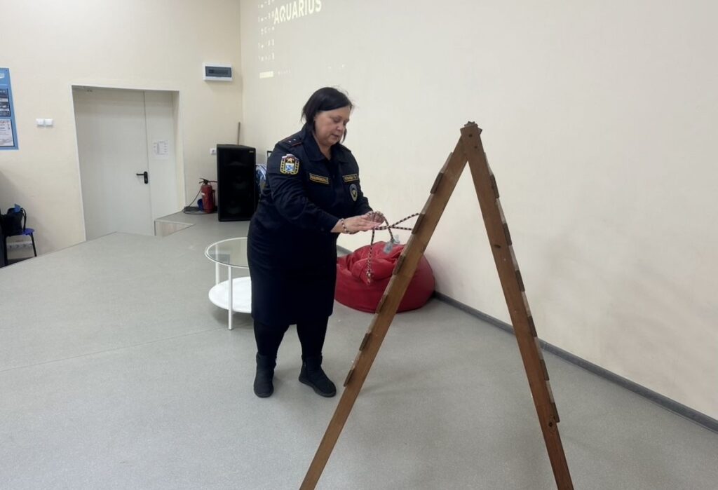 Занятие началось с практической части — отработки навыков вязания спасательных узлов. Ребята тренировались работать с верёвкой, осваивали основные узлы, которые применяются при спасательных работах, оттачивая точность и скорость выполнения.