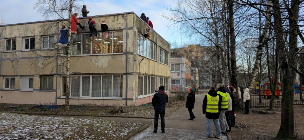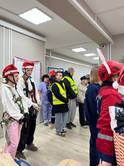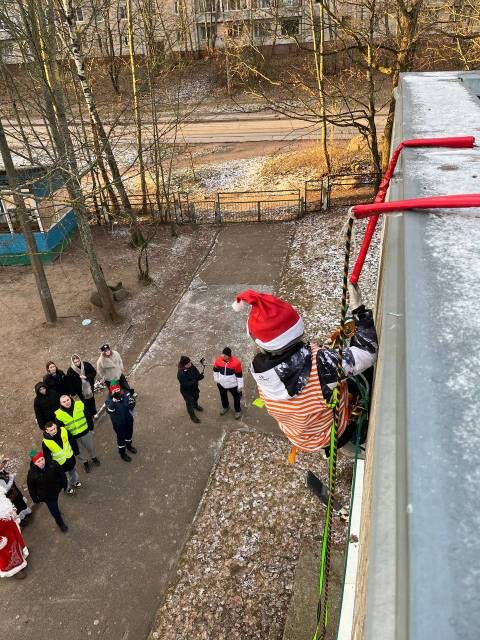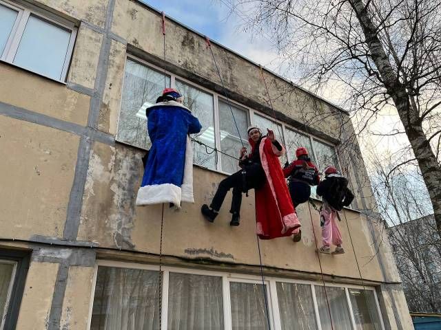 В костюмах Дедов Морозов и Снегурочек добровольцы спустились с крыши здания при помощи альпинистского снаряжения. Представьте удивление и радость детей, когда в их окна заглянули настоящие волшебники!