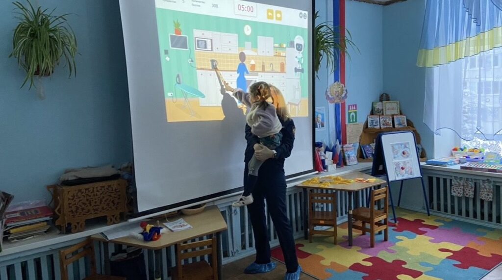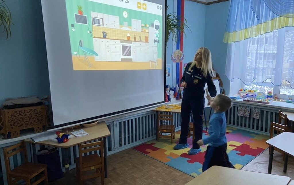 Во время работы с тренажерами на экране демонстрировались изображения различных бытовых ситуаций. Дети должны были определить потенциальные угрозы, объяснить, чем они опасны, и рассказать, что нужно сделать, чтобы не допустить возгорания или как правильно действовать, если что-то пошло не так.